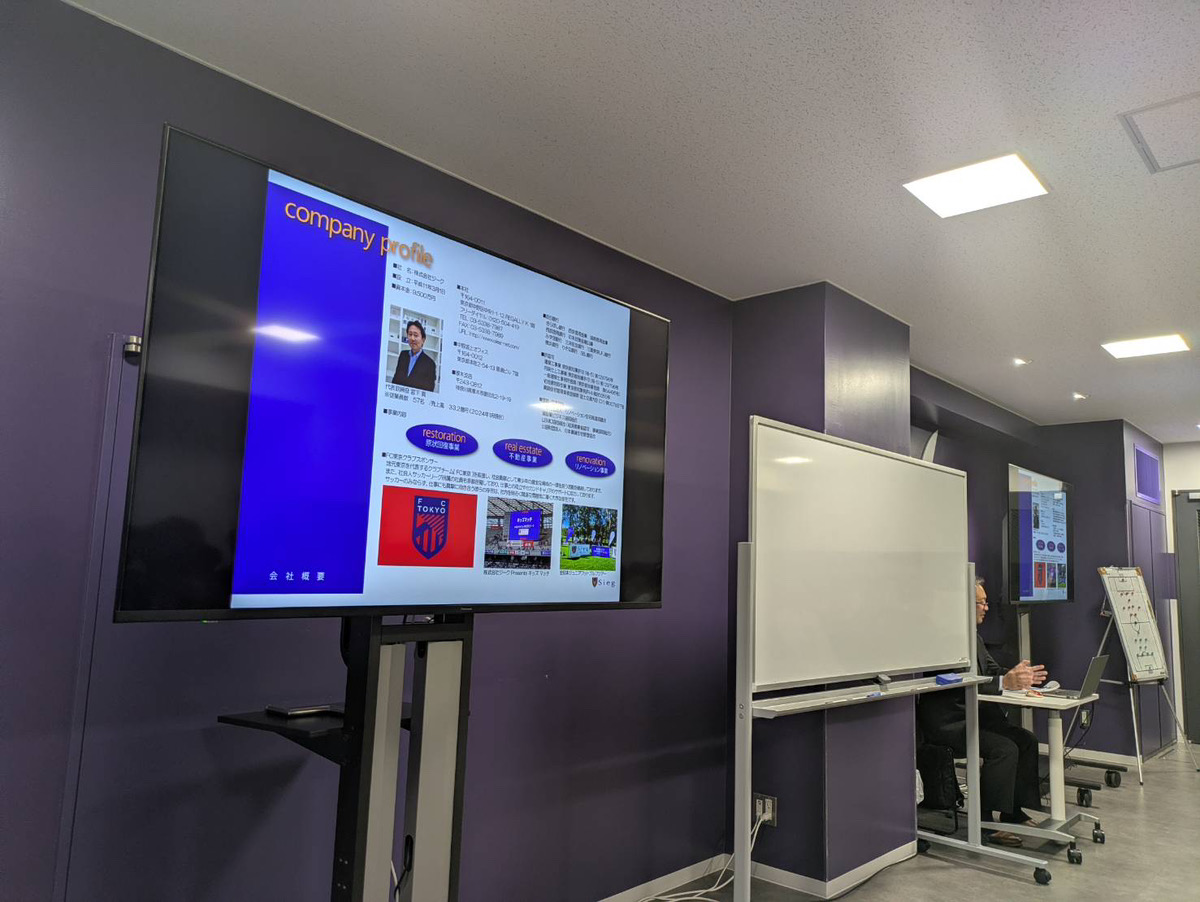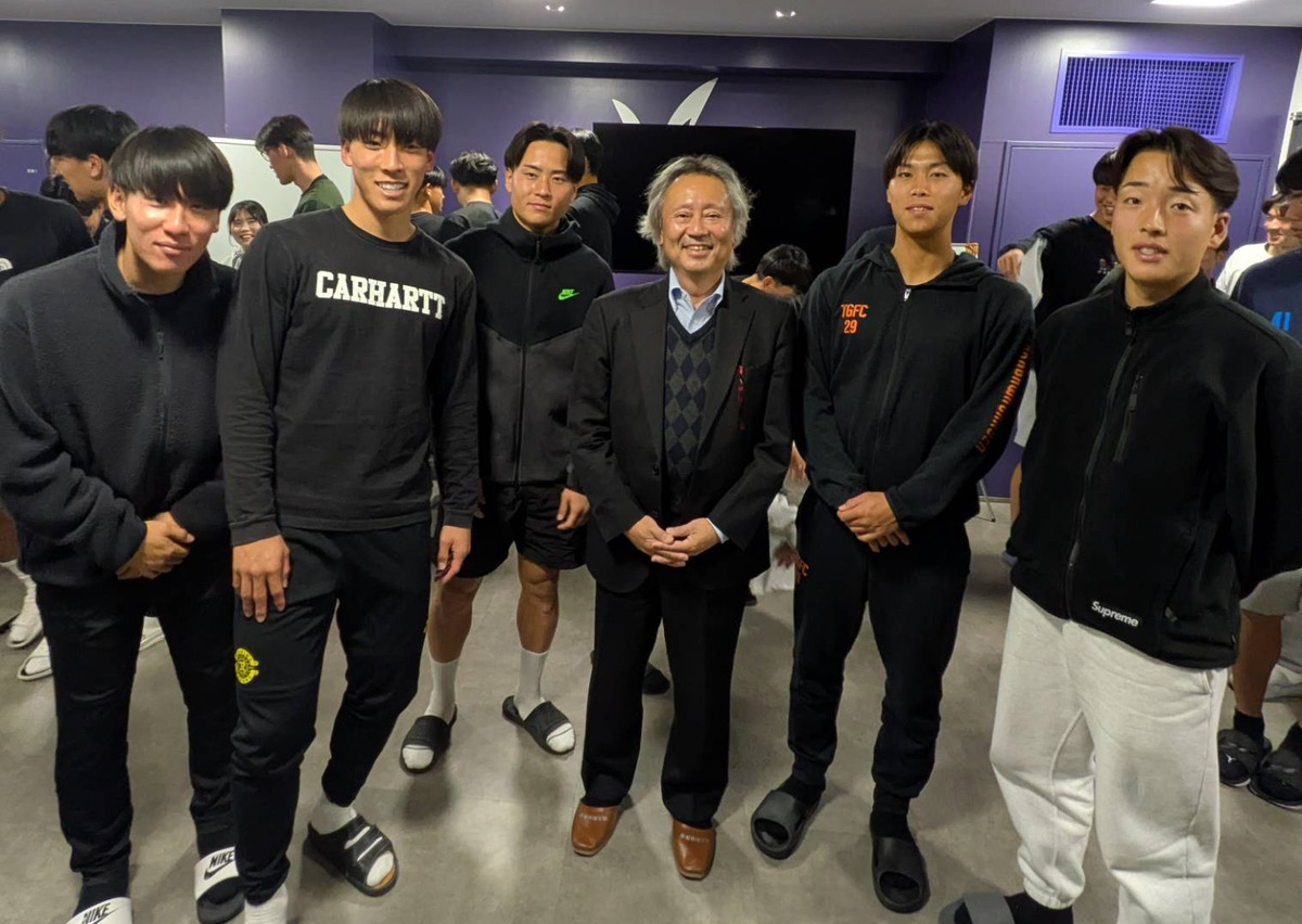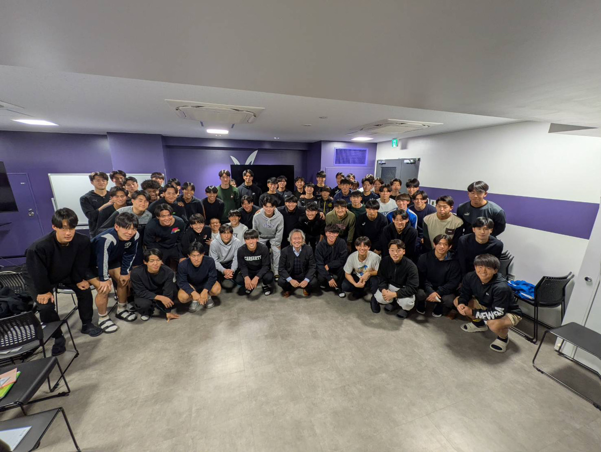 社員一同、応援しています!!明治大学サッカー部の皆様へ講話中の様子